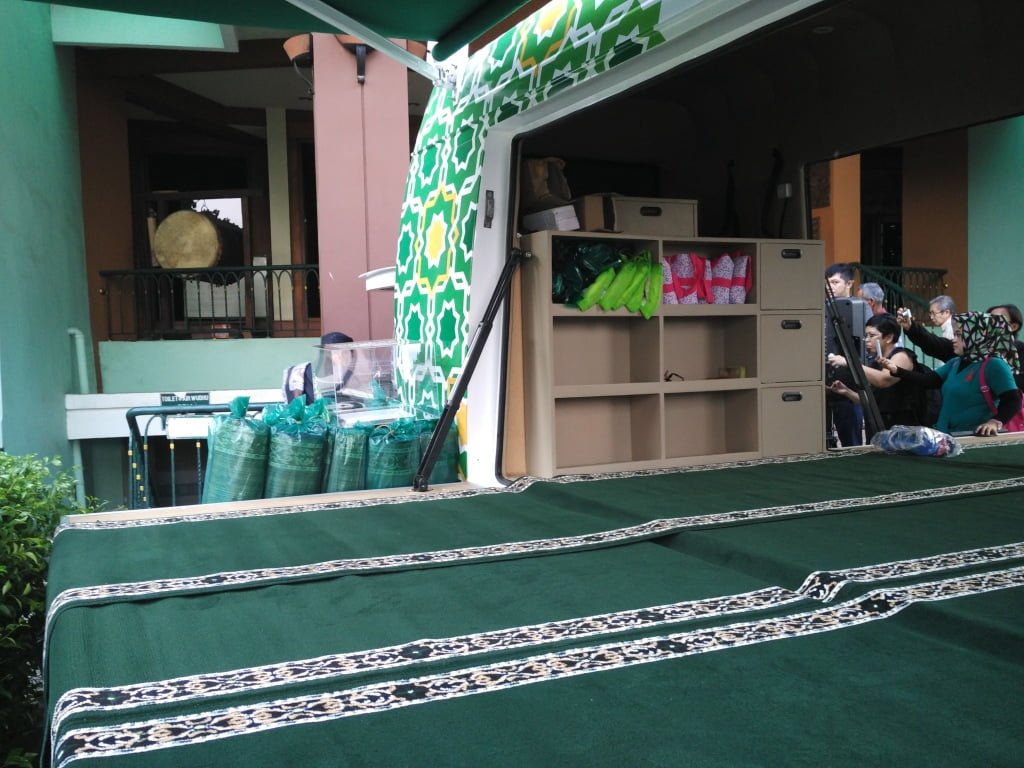 Kedua sisi badan mobil bisa dibuka sebagai “panggung” sehingga bisa shalat diatasnya