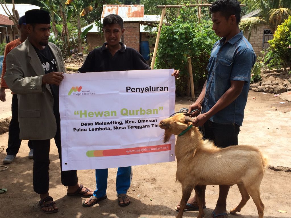 LEMBATA. Menyambut hari raya Idul Adha, Yayasan Masjid Nusantara bersama menyalurkan Hewan Qurban di Desa Meluwiting, Kepulauan Lembata, NTT (13/09). Sudah lebih dari 6 tahun tidak ada yang berqurban di Desa ini, faktor ekonomi menjadi salahsatu alasannya. Alhamdulillah melalui program “Qurbanku untuk Masjid”, pada tahun ini di Desa Meluwiting dapat berqurban dengan titipan hewan qurban dari donatur.